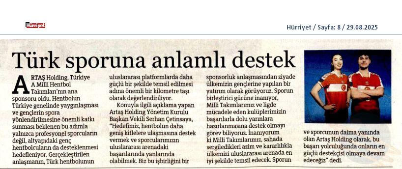 28.08.2025 - HÜRRİYET :ARTAŞ'S MAJOR SUPPORT FOR TURKISH HANDBALL